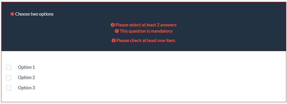 | Description | On a mandatory multiple choice question configured for two minimum answers, if you don't select any, you get conflicting help messages: | ||||