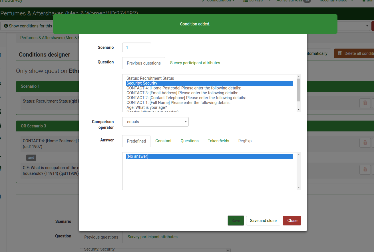 | Description | Firstly I like to say that I really like the cosmetic changes rolled out in the last release to the conditions. However these have also given us a small usability issue. To explain, the way we roll surveys is we have a final question always which is a "sorry you do not meet the criteria we need..." Question. The way this works is that it is only shown when it meets certain scenarios. It always has 4+ scenarios and sometimes upto 20 depending on length of survey. In all previous releases, once you save a condition within the scenario the question you had highlighted remains so which is useful so you know where your at. As did the scenario number you were on. In latest release these are not being remembered therefore really slowing down the process and increasing the chances of errors. | ||||