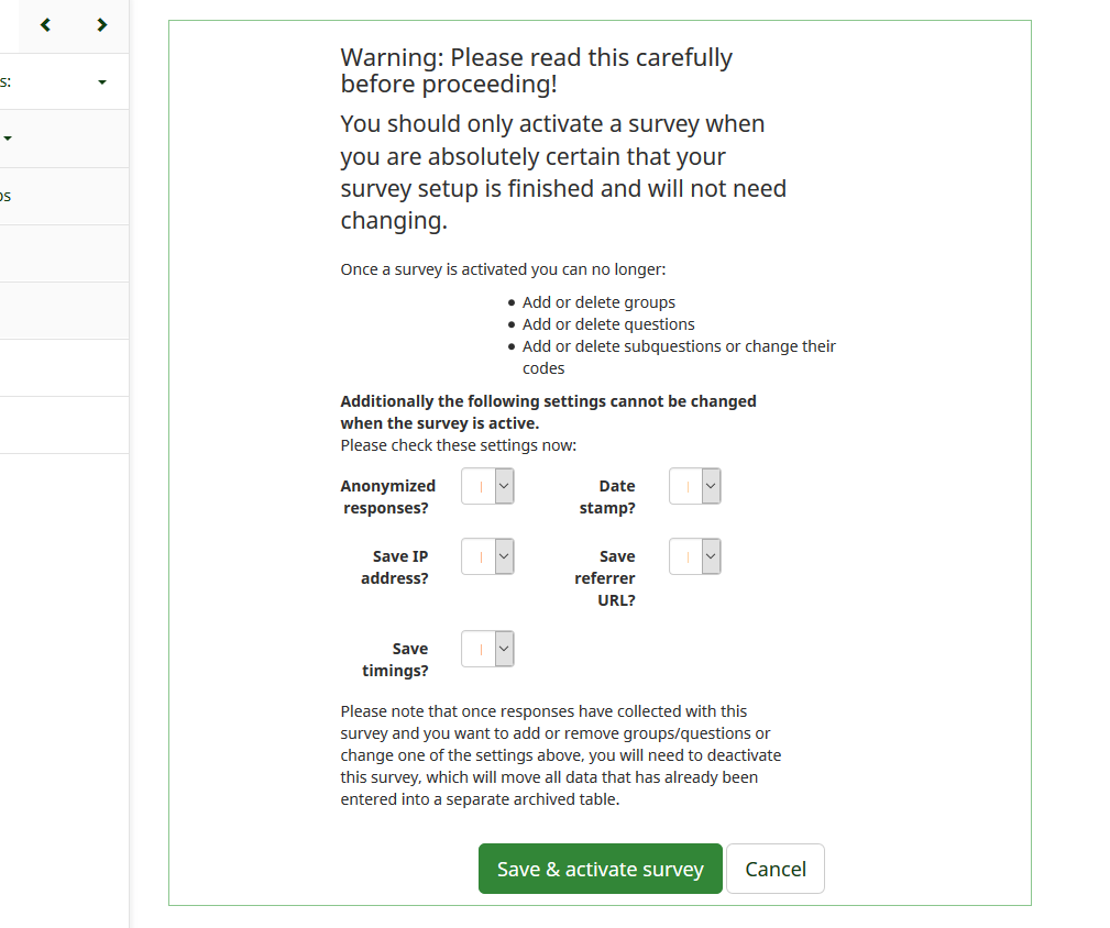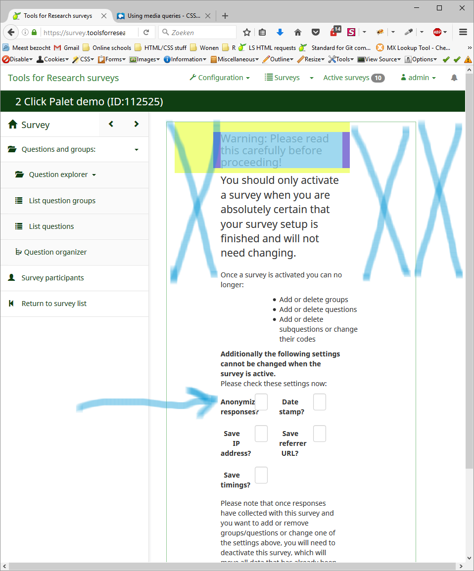 | Description | When I want to activate the survey, I get shown a screen which is too narrow, due to col-sm-7 col-sm-offset-2 class in messagebox (which is also narrowed down by a col-sm-10 statement.) Please give the message box a col-sm-12 class and all content full width. This way you surely need a screen of more than 1280 px wide, while it should not have to be necessary... | ||||