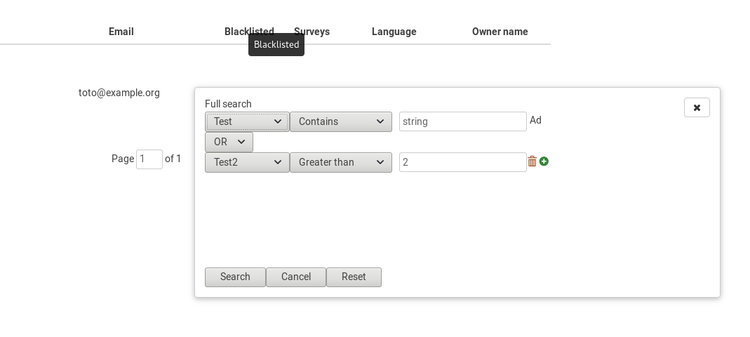 logically equivalent: for the operators (>, =, <). Like I said, the only missing operator is "not contains" and "or". 10 minutes to show 1000 entries: wow.That's a problem. I didn't wrote the model for that part, it's probably possible to get it working faster. Also, I remember that jQgrid was having a huge speed problems. Eg: in survey list, when having a lot of surveys, it took a very long time to load. |