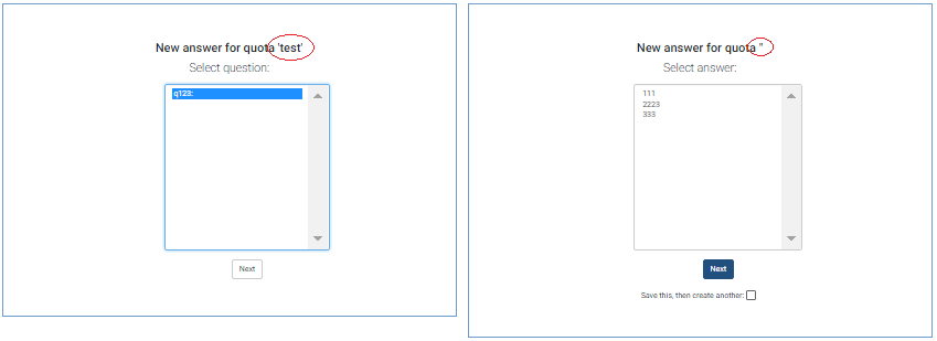 | Description | When you choose a question you see 'quota name'. After that you should choose one of the answers and quota name didnt show, only two ' symbols. I dont have any errors in console. | ||||