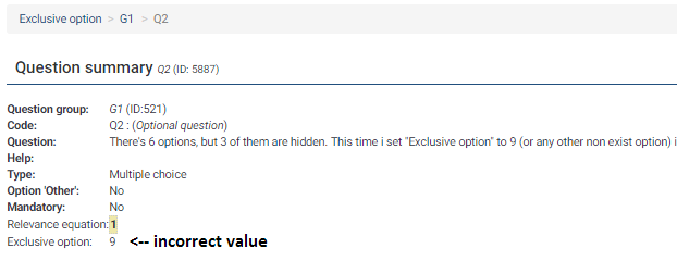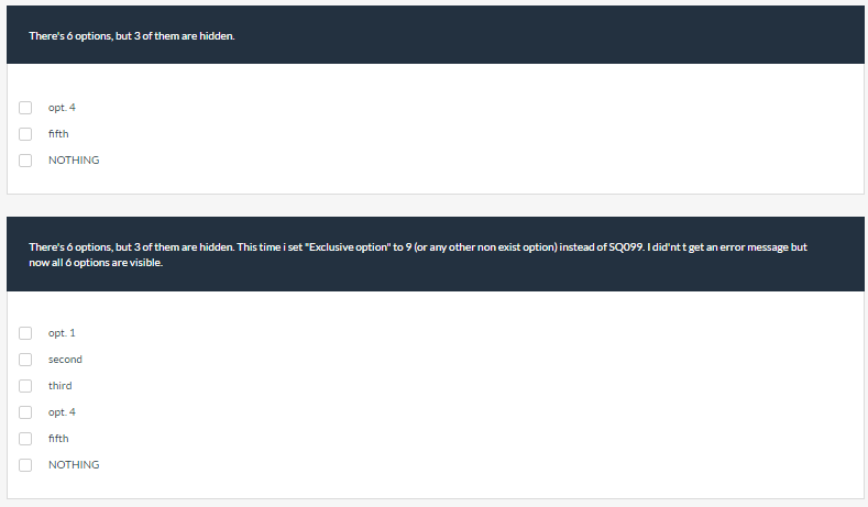 | Summary | 11957: an error in the "Exclusive option" field cause strange survey behavior |