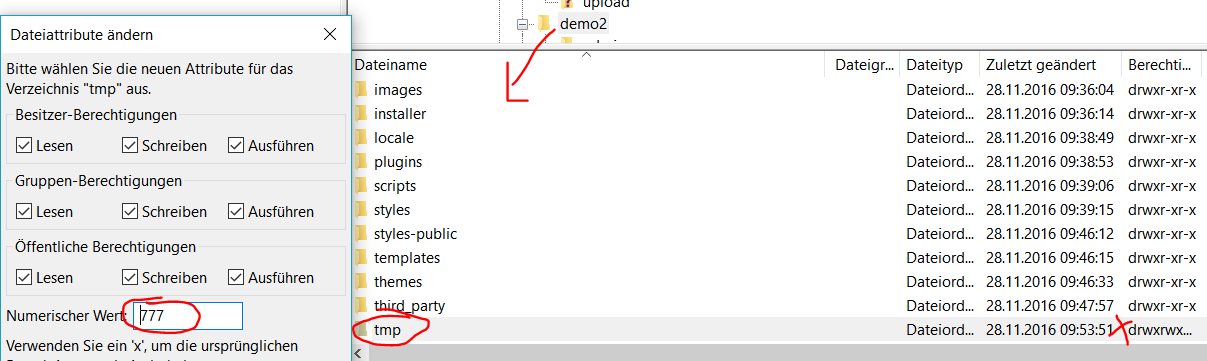 What do you mean by "included folder"? I told filezlla to set rights 777 for /tmp and /upload AND all files + subfolders. |