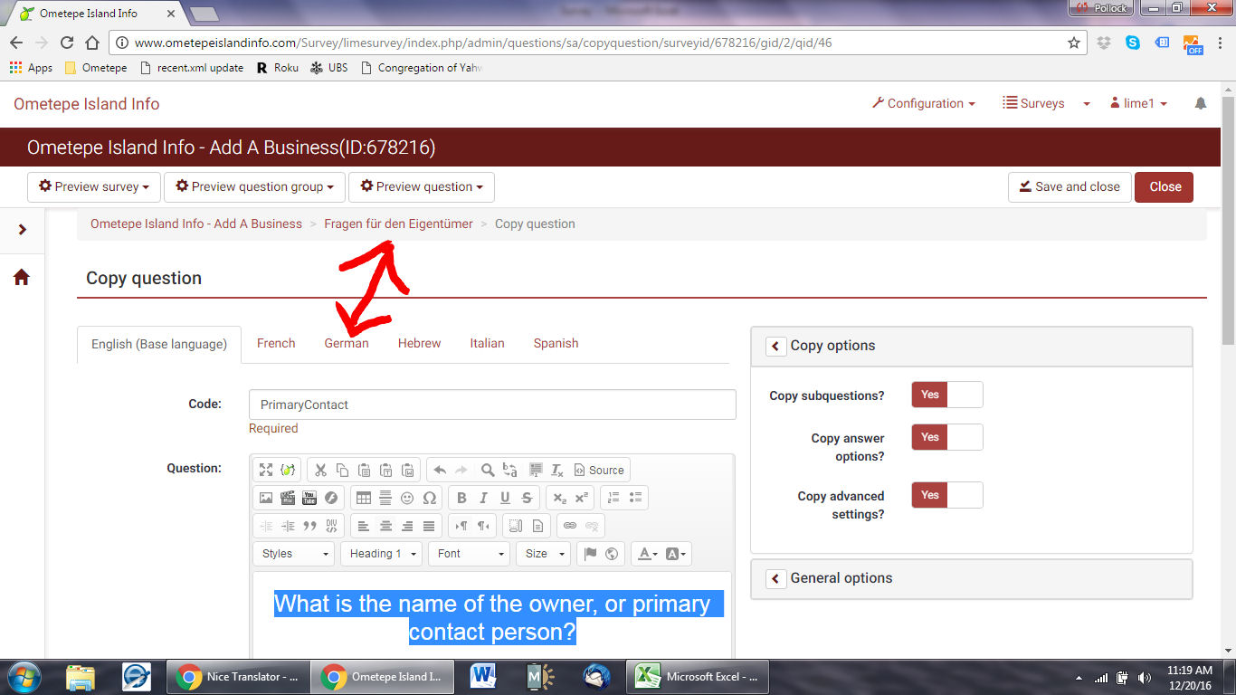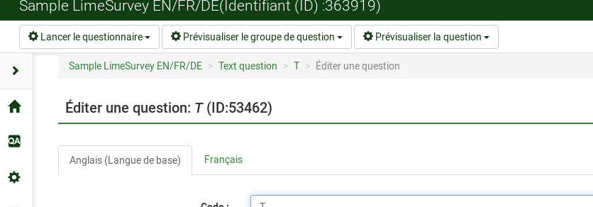 | Steps To Reproduce | create survey, basic template. Have 3+ languages, create any question. Copy question. and you will see at the top it shows the group name in German (my 3rd language or 6) | ||||