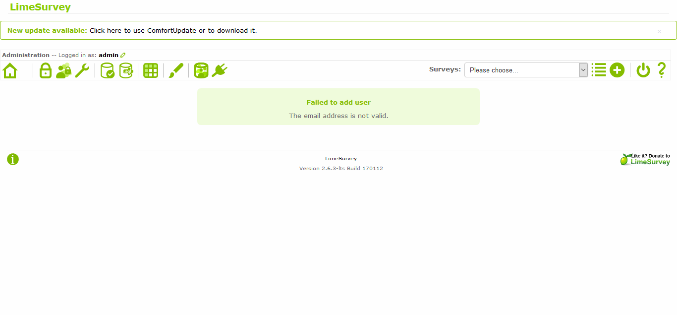 | Summary | 12090: Cannot add new user (survey administrator) | ||||