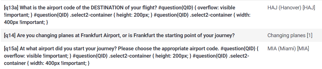 | Description | When viewing a single response the system lists CSS and JS embedded at the question text, see attached screenshot. This also applies to the main response view listing all response in a tabular overview. There you can see the CSS/JS at the tooltip. | ||||