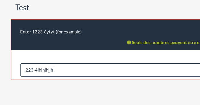 | Steps To Reproduce | Import survey included, enter 1234-kgkgkh , click next : PHP error , no js error. Test to with 223,,ddd | ||||