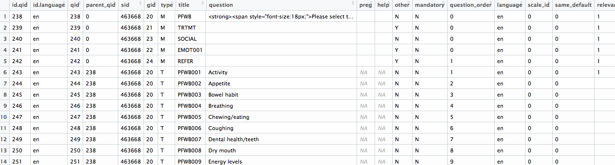 | Description | I'd like to add the "code" for headers that are generated with the export_responses $sHeadingType = "code" to list_questions. This is important for users wanting to map "nice" looking text for questions to response data (for example, in Shiny R, to populate CheckBoxes that are labelled "Activity" but pass the code "PFWB.PFWB001." see below for an example... in case that doesn't look right, see pastern here: https://paste.fedoraproject.org/paste/L9fIntmpMyjqksr7ySFeOF5M1UNdIGYhyRLivL9gydE= | ||||