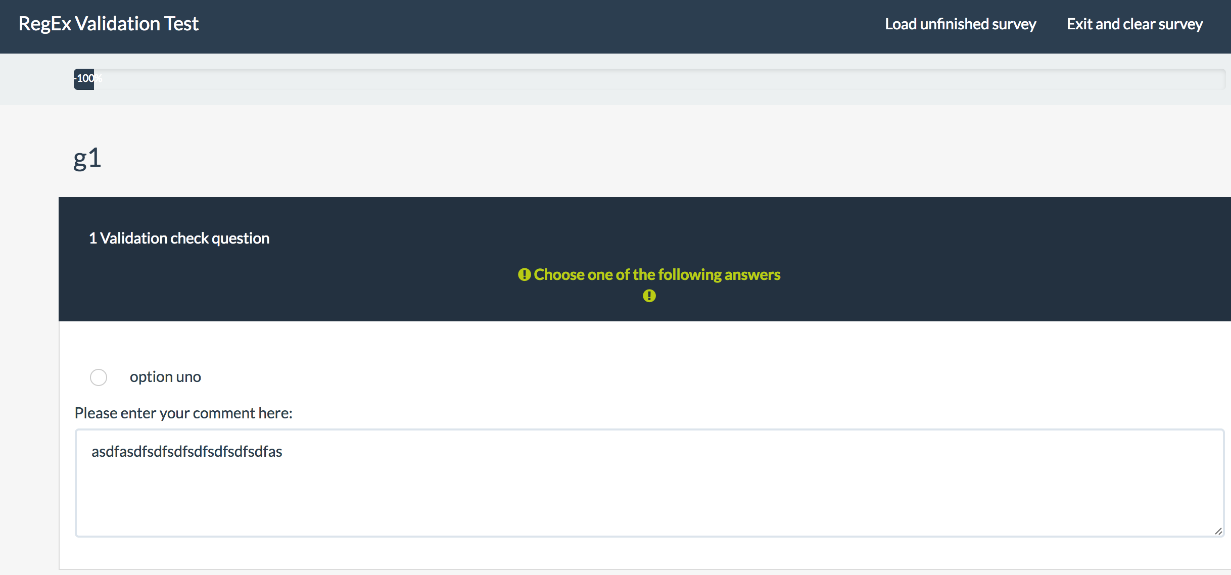 | Description | In the latest build of LS as of this bug, using a RegEx equation to validate the "comment" field of a List with Comments question is not responsive. An example is here: https://demo.limesurvey.org/index.php?r=admin/questions/sa/view/surveyid/281598/gid/52/qid/189 (Note: this functionality was working on a previous version of limesurvey - build from 5/12/2016) | ||||