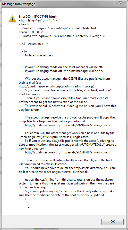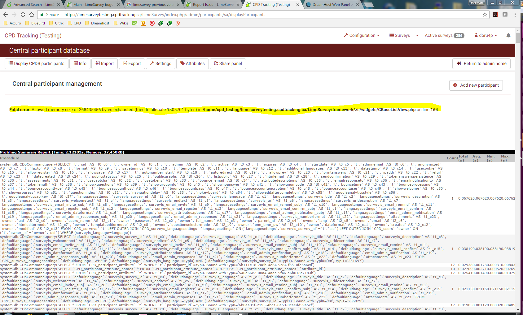 | Description | After updating to the latest version (2.64.1+170310) every time someone selects 2500 or more from the rows per page drop down menu in the Central Participant Database we get this error message: (see attached image) I haven't been able to go back to the previous version because I don't see it posted anymore (https://www.limesurvey.org/downloads/category/24-archived-releases) They used to be listed in the old version of the page, but in this new version I can't find them. I'm also getting the same error on the site that we use with GitHub. Apparently LS is asking to increase the memory size. Currently we allocated 256MB. I thought the required was 128MBs. | ||||