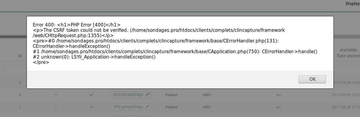 I think some public user open multiple windows too, with this fix : public user see CRSF issue a lot more : i think we MUST improve error page .... see https://github.com/LimeSurvey/LimeSurvey/pull/605 | ||||