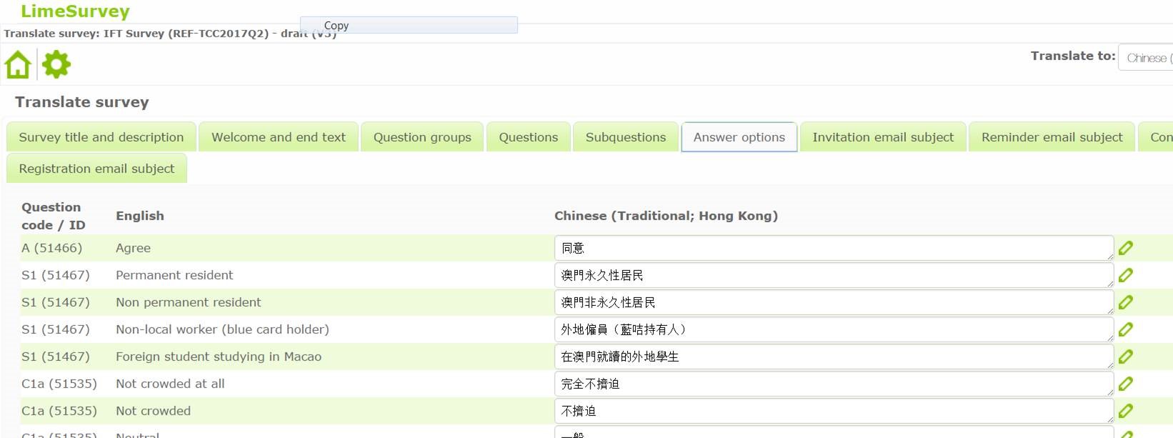 | Description | The function of quick-translation (answer options) is not working – I finished the translation and saved, but it didn’t reflect in the survey (but it works perfectly for questions/sub-questions) | ||||
