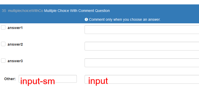 | Description | In the multiple choice with comment question different classes are being used: both input-sm as well as input. Result: inconsistant look of question rendering. Se attached survey. | ||||