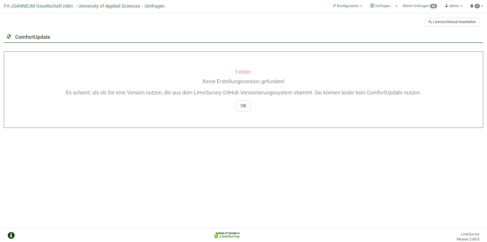 | Complete LimeSurvey version number (& build) | If it is right, it says: Version 2.65.0 | ||||