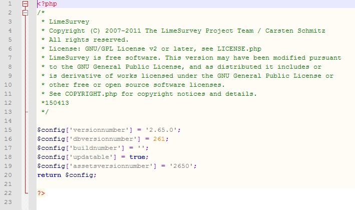 ok so please have a look inside the file: you'll find a field called "buildnumber": Bu until now, I'd say it seems that you're using a modified version of LimeSurvey, or that you did a manual update at some point. Can you confirm that? |
