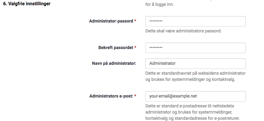 | Description | At step 6 in installation there is a mail address field with a default mail address: your-email@example.net This should exist and be picked from language files. See screenshot. | ||||