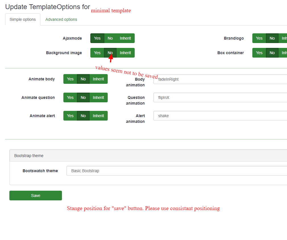 | Description | Trying to test minimal template (hopefully useful as basic template to start from), but keep seeing all kinds of animations/backgrounds etc. After using template options page (also see: https://bugs.limesurvey.org/view.php?id=12556) all template files seem to disappear. Please see images. Unsure how to proceed. | ||||