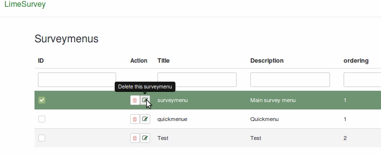 | Description | if you hover the mouse over the edit button, you will see that 'Delete this surveymenu' message shows up | ||||