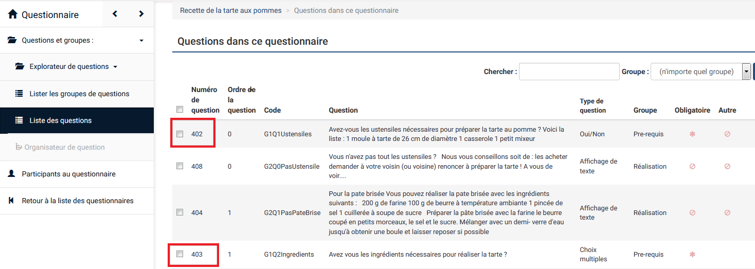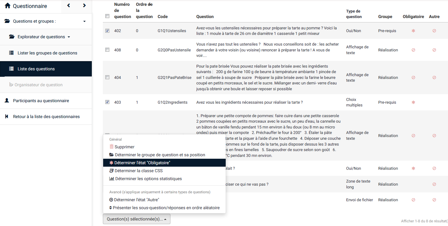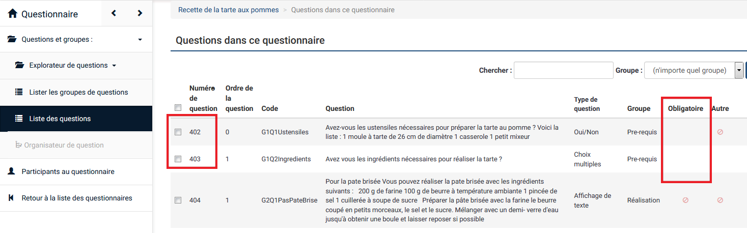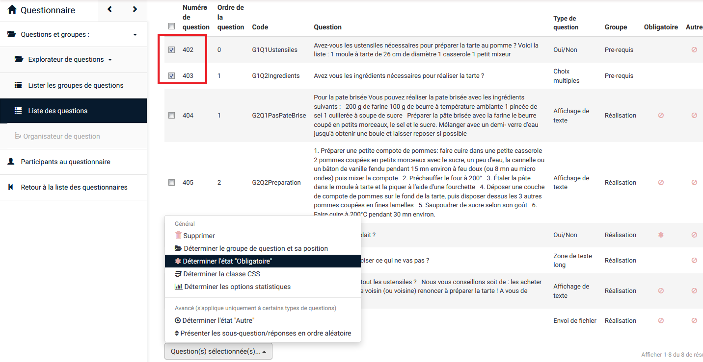 | Description | When you are in the list of questions, if you tick mandatory questions and use the functionality, it works. If you click on the header to sort the questions and use the same functionality, it does not work anymore. See screenshots. Reproduced on a 2.67.3 and on demo site. | ||||
