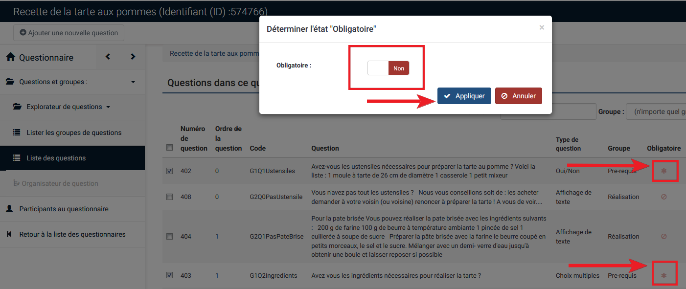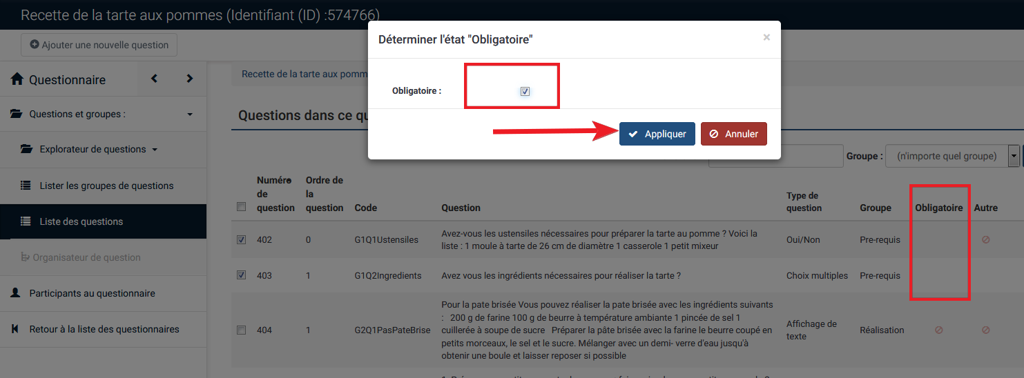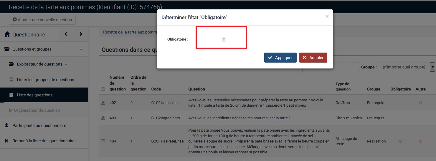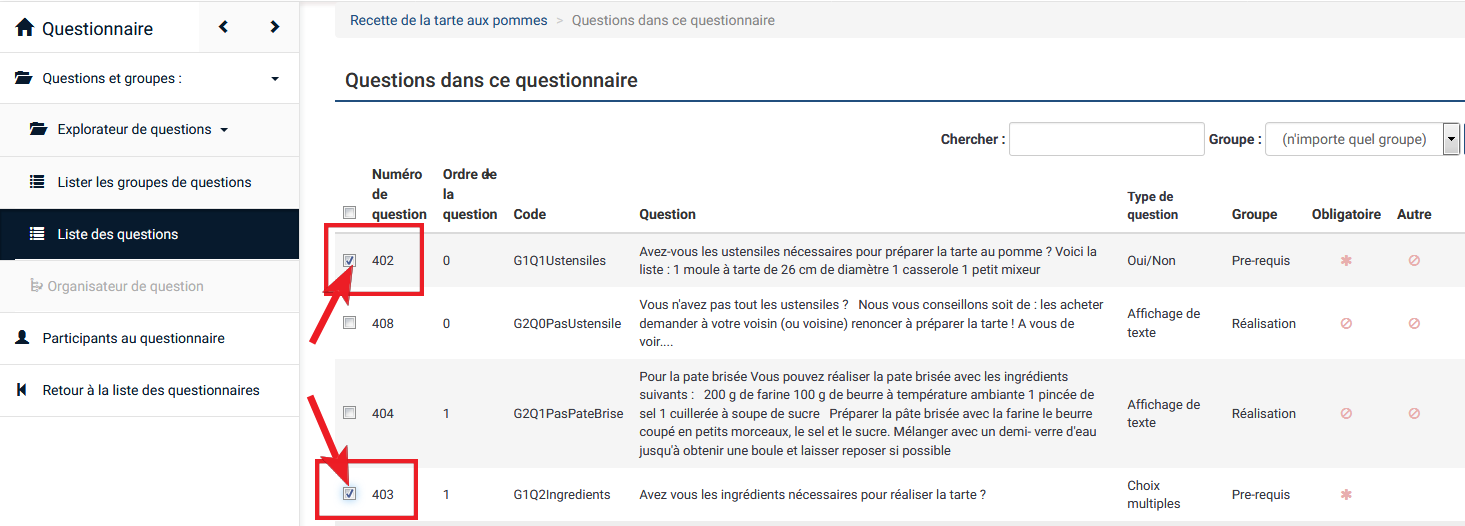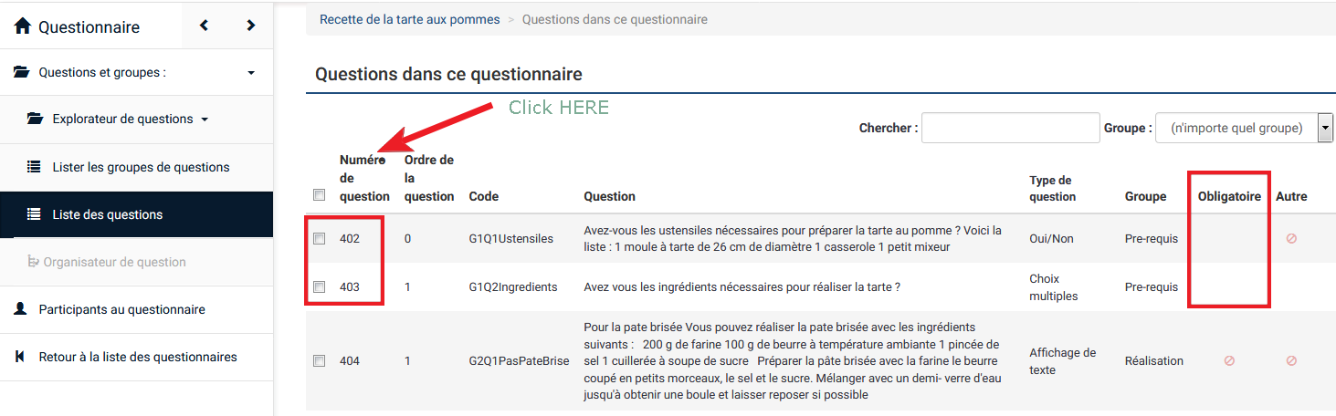 | Description | When you are in the list of questions, if you tick mandatory questions and use the functionality, it works. If you click on the header to sort the questions and use the same functionality, it does not work anymore. See screenshots. Reproduced on a 2.67.3 and on demo site. | ||||