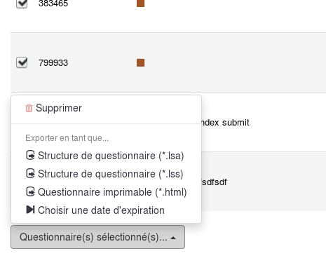 | Description | When check some survey and try to delete (on Survey listing): nothing happen | ||||