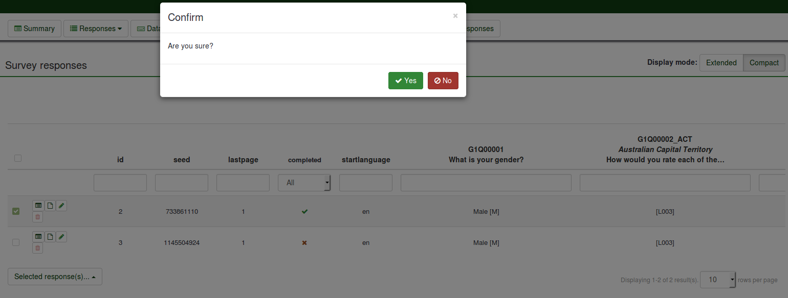 | Description | When I click on the red trash button, the "confirmation" window pops up. If I click yes, the popup does not disappear. But, if I close the popup by clicking "no" or the "x" button and refresh the survey responses table/page, it appears that the respective entry was already deleted. | ||||