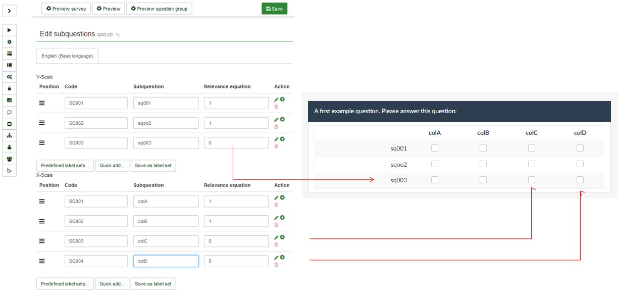 | Description | Using EM or a simple 0 or 1 in the relevance equations field for X and Y scale (options and subquestions) of a matrix question shows now reaction in the survey. Both are ignored. | ||||