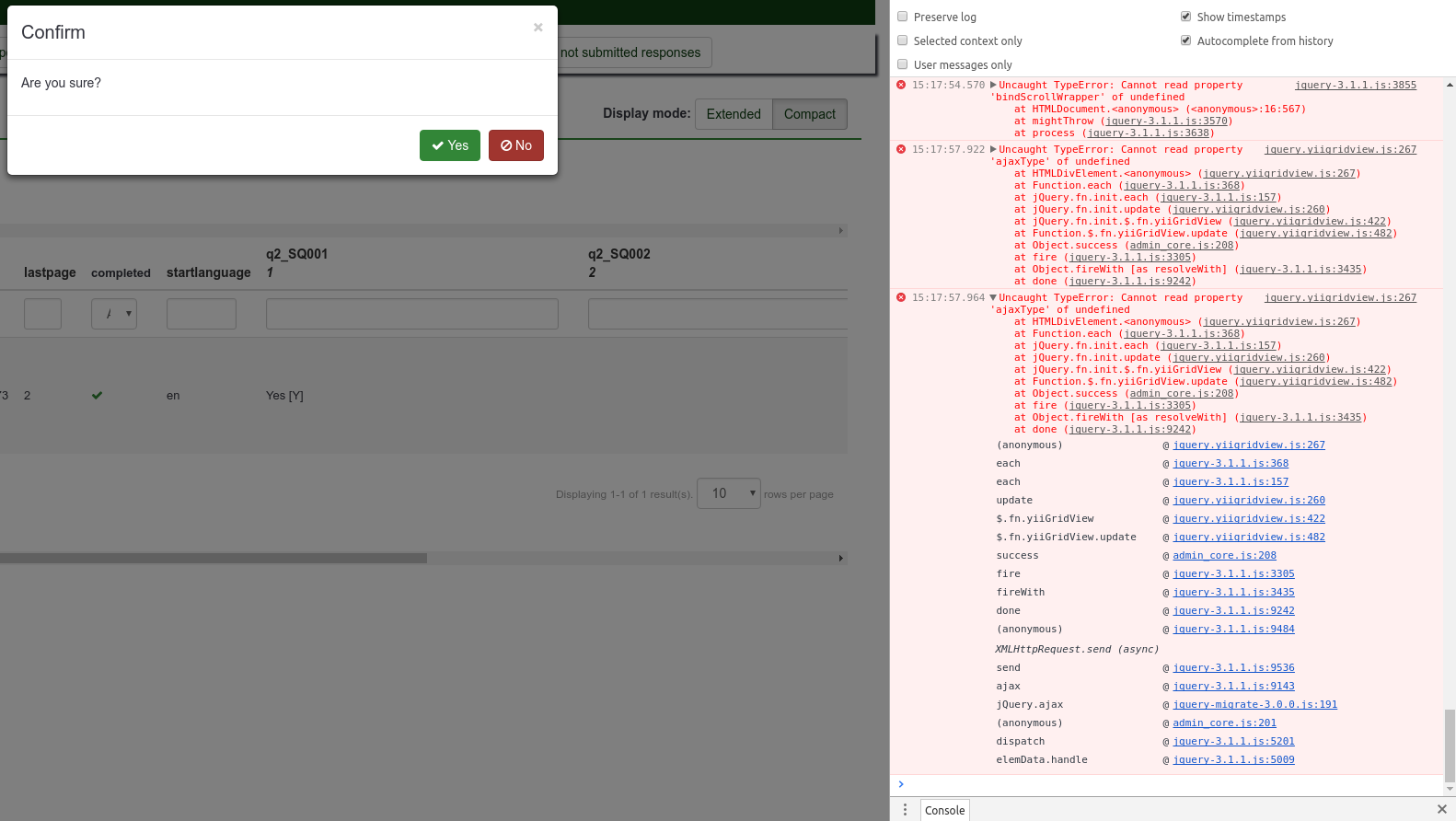 | Summary | 12911: JavaScript error when deleting response, modal doesn't fade out |