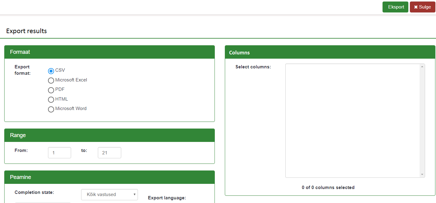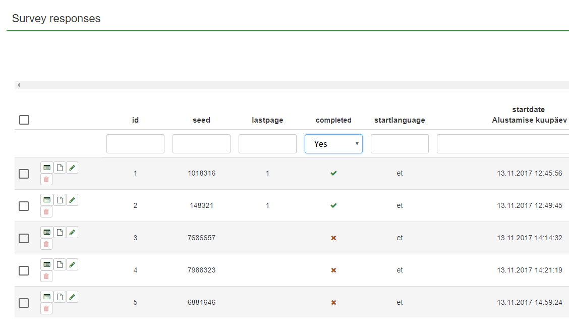 | Description | Limesurvey installed in my server: 1) In the Limesurvey "Answers - Answers and statistics - Display responses" does not work filtering answers by id, seed, lastpage, completed etc. When clicking on the column header and choosing e.g. filtering by Completed (Yes / No / All) nothing happens. In the previous version when I chose Yes for example, I could see all completed answers without uncompleted. 2) When trying to export answers in Limesurvey questionnaire I have made, Export - Export responses - choosing CSV, MS Excel, PDF, etc. and pushing Export button I get a notice: "At least one column must be selected for export." | ||||