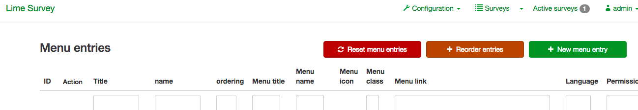 The buttons are a little too narrow. When translating into other languages strings do not fit. The title of the page is "Menu entries". Why not name the buttons Reset, Reorder and New? After all, it is obvious Reset, Reorder and New have to do with menu entries.... The same is true in the headers below. Menu name -> Name, Menu icon -> Icon, Menu class-> Class. Title, name and ordering already exists in a short manner. |