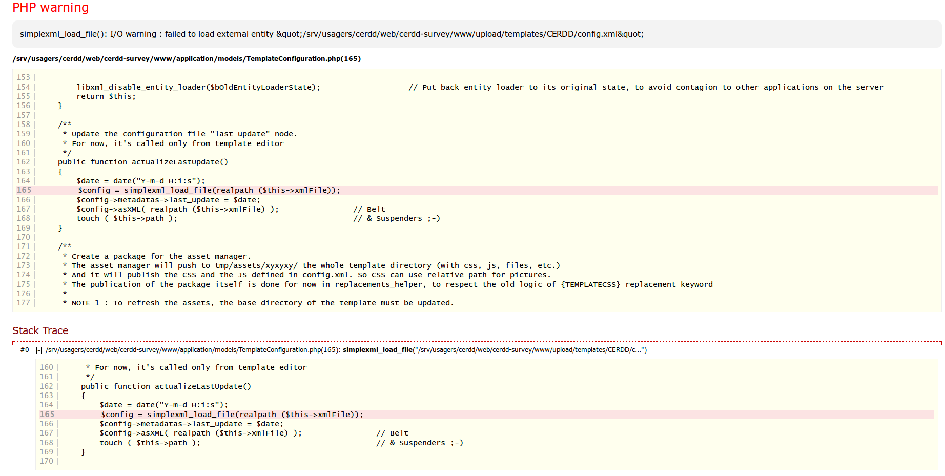Error happens on the following page http://www.survey.xxxx/index.php?r=admin/templates/sa/templatesavechanges |