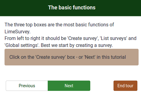 | Description | As you can see in the box, you can either click on Next or on the Create new survey button. However, When I click on the Create new survey button, the tutorial crashes:
