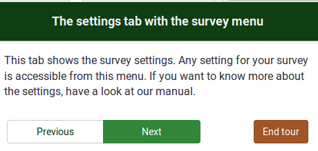 | Description | If you click on this tab, the survey settings menu will be displayed. The most important settings of your survey are accessible from this menu. If you want to know more about them, check our manual. | ||||