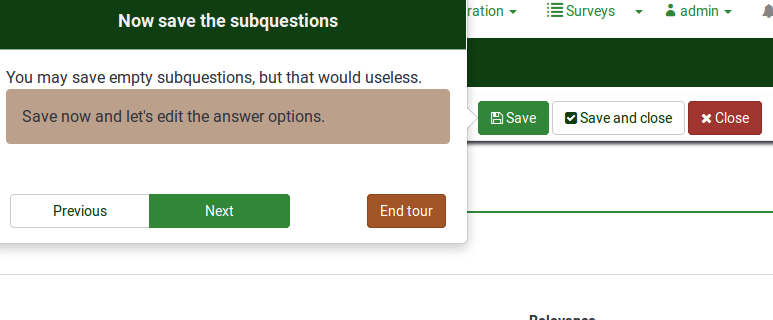 | Description | You may save empty subquestions, but that would be pointless. Maybe we could direct them to click on the save and close button? So that the tutorial continues smoothly :) (if you click next, the subquestions get saved, but the panel does not get closed). | ||||