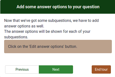 | Summary | 13044: Tutorial - text - add some answer options to your question | ||||