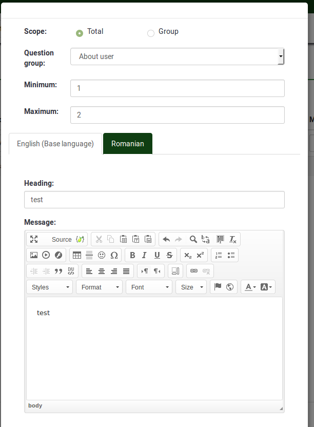 | Description | Would like to wriet a translation of the assessment when I create a new assessment. I click on the tab, but nothing happens. | ||||