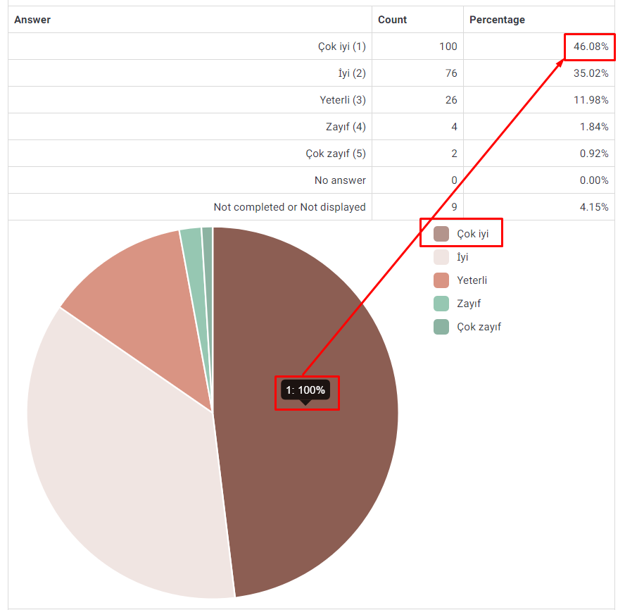| Description | Hi, On statictics page the system shows % (percentage) sign wronly. Please check attached picture. Normally it should show only 1: 100 but it shows as 1: 100%. The number 100 is count of the answers but it shows like it is percentage. | ||||