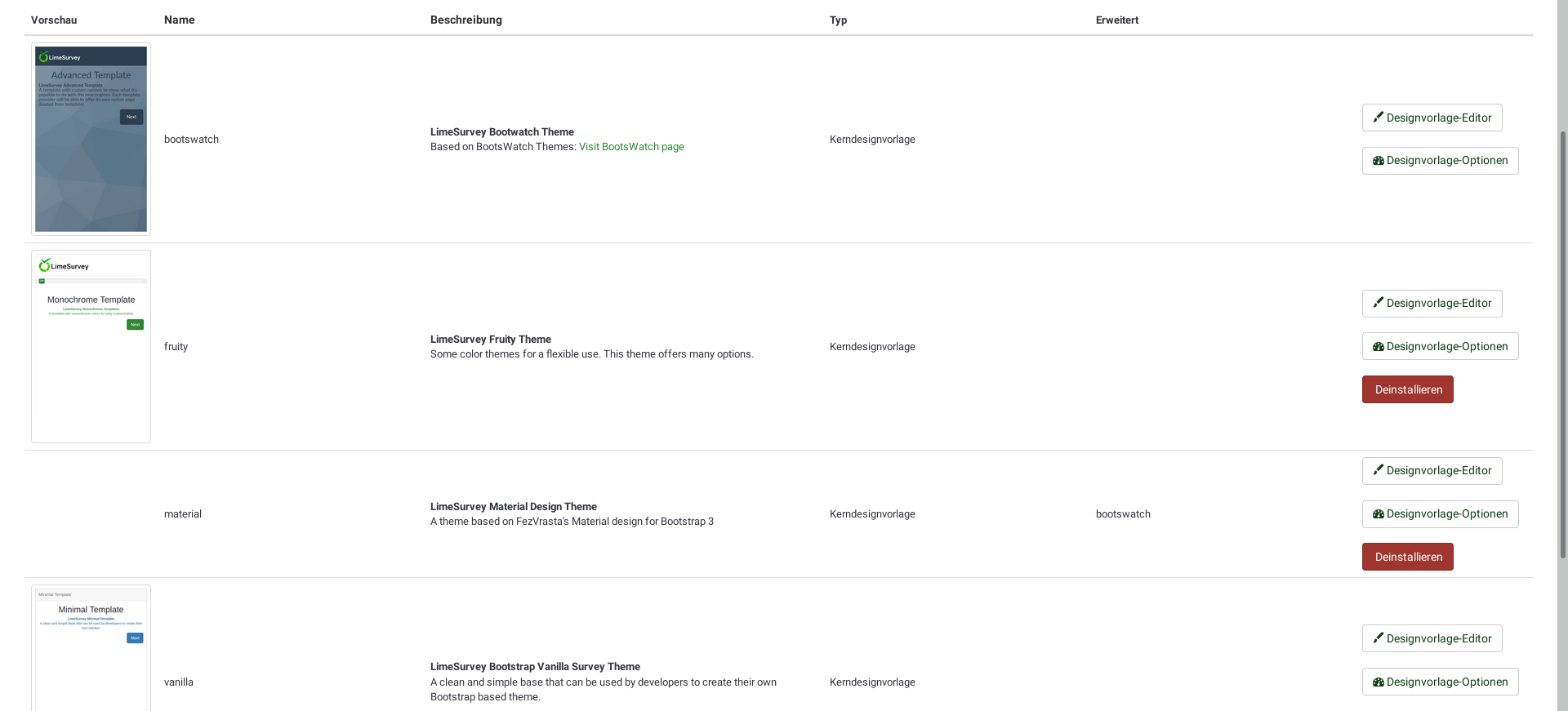 | Additional Information | PHP error in debug mode: WrongTemplateVersionException Das Layout layout_survey_list.twig für die Designvorlage bootswatch kann nicht gerendert werden. Die Vorlagenversion in der Datenbank ist 1.0, aber in config.xml ist sie 2.0. Bitte installieren Sie die Vorlage erneut. /var/www/limesurvey/application/core/LSETwigViewRenderer.php(53) 41 $line = file_get_contents($oLayoutTemplate->viewPath.$sLayout); | ||||