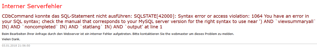 | Description | Dear programmers, thank your for your work! I installed version 3.0.1+171228 freshly on a shared server of https://all-inkl.com/. After I had created the MySQL database manually, I went through the installation process without any difficulties. MySQL: 5.6.38 The following error message is shown whenever I use the "Statistik anzeigen" button to receive an interpretation inside LimeSurvey; the error reproduces with each survey I have created so far: Interner Serverfehler | ||||