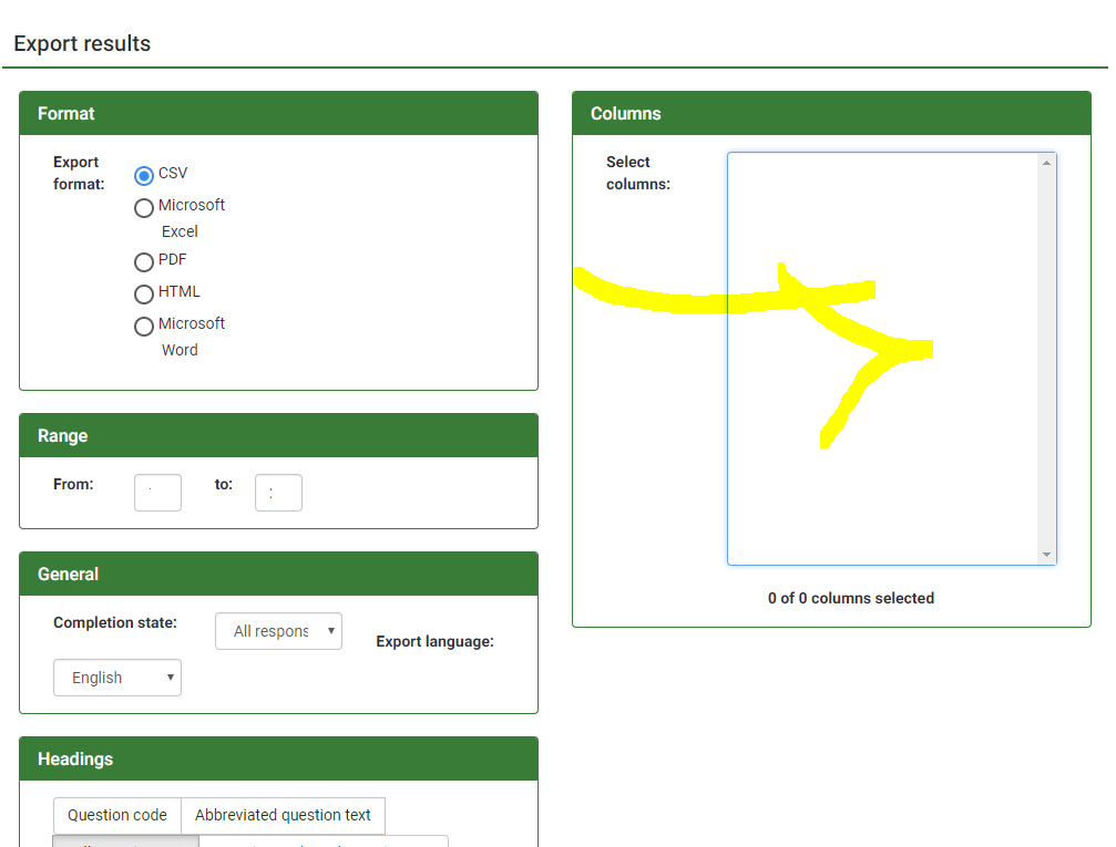 Additional info: tried a creating a simplyfied survey, with just one question and no time variables. The problem is the same. Notice in the screenshot, that that the columns widget is completley empty. |