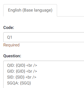| Description | The "QID", "GID" and "SGQ" Expression Manager variables are not rendered. See attached screenshots and sample survey. | ||||