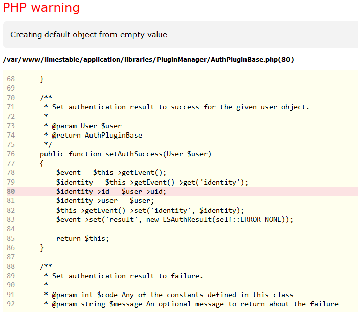 | Additional Information | PHP warning Creating default object from empty value /var/www/limestable/application/libraries/PluginManager/AuthPluginBase.php(80) 68 } | ||||