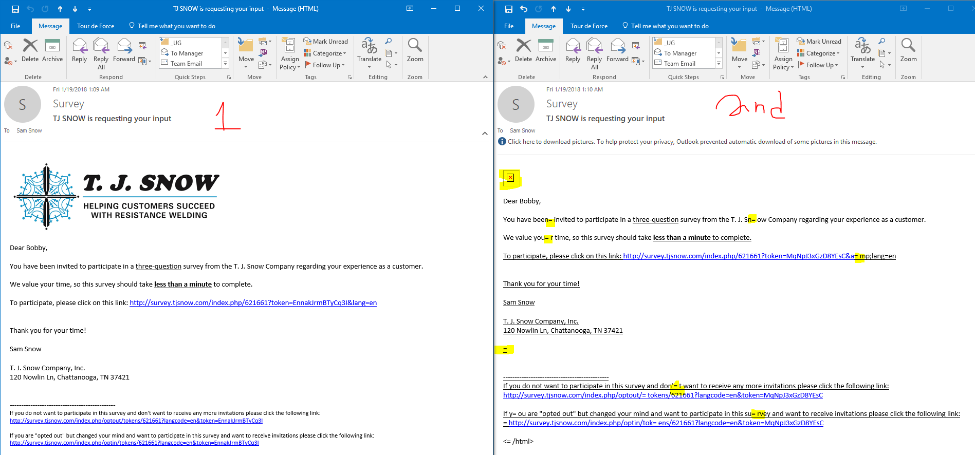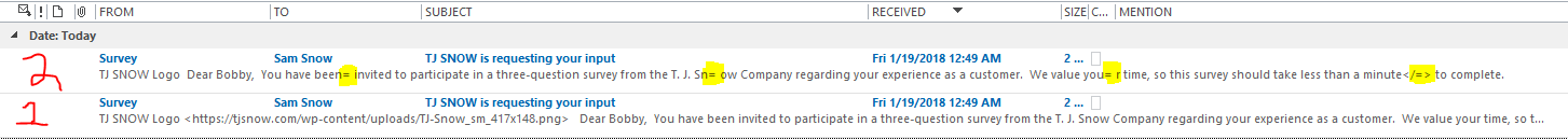 | Description | I got reports that some users who received our survey invites and reminders received corrupted emails. By corrupted, I mean that every so many characters a "= " shows up in the email. This results in broken links, broken images, etc. NOT GOOD! | ||||