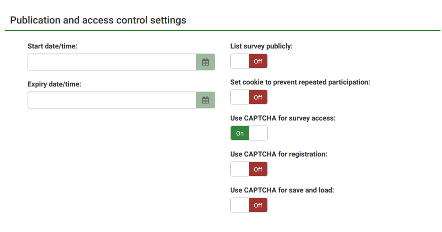 | Steps To Reproduce | Go to a survey and choose: Publication and access control settings -> Use CAPTCHA for survey access: ON | ||||