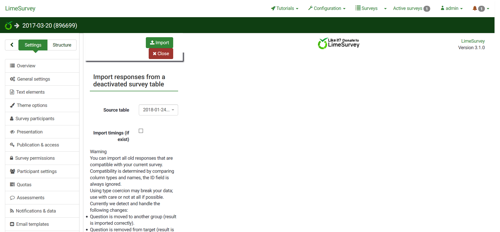 | Description | If you import a response table of a deactivated survey the design is messed up. | ||||