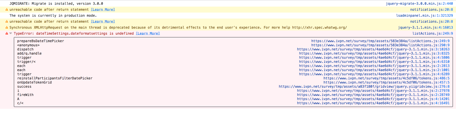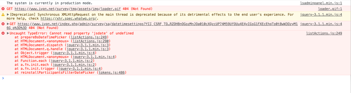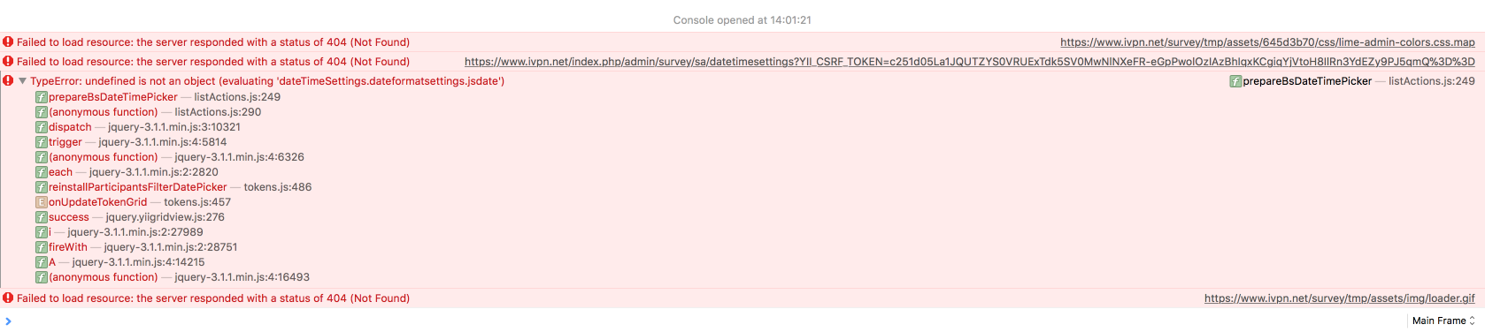 | Description | After updating to v3, when you attempt to use the numbered pagination controls at the bottom of the survey participants list you get an exception in the console: First you notice that the following resource does not load: GET http://www.domain.com/index.php/admin/survey/sa/datetimesettings?YII_CSRF_TOKEN=xyz 404 (Not Found) which leads to: Uncaught TypeError: Cannot read property 'jsdate' of undefined which results in javascript controls not working e.g. Unable to send invites to selected participants | ||||