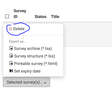 | Summary | 13310: Cannot delete surveys in Survey list when debug == 1 | ||||