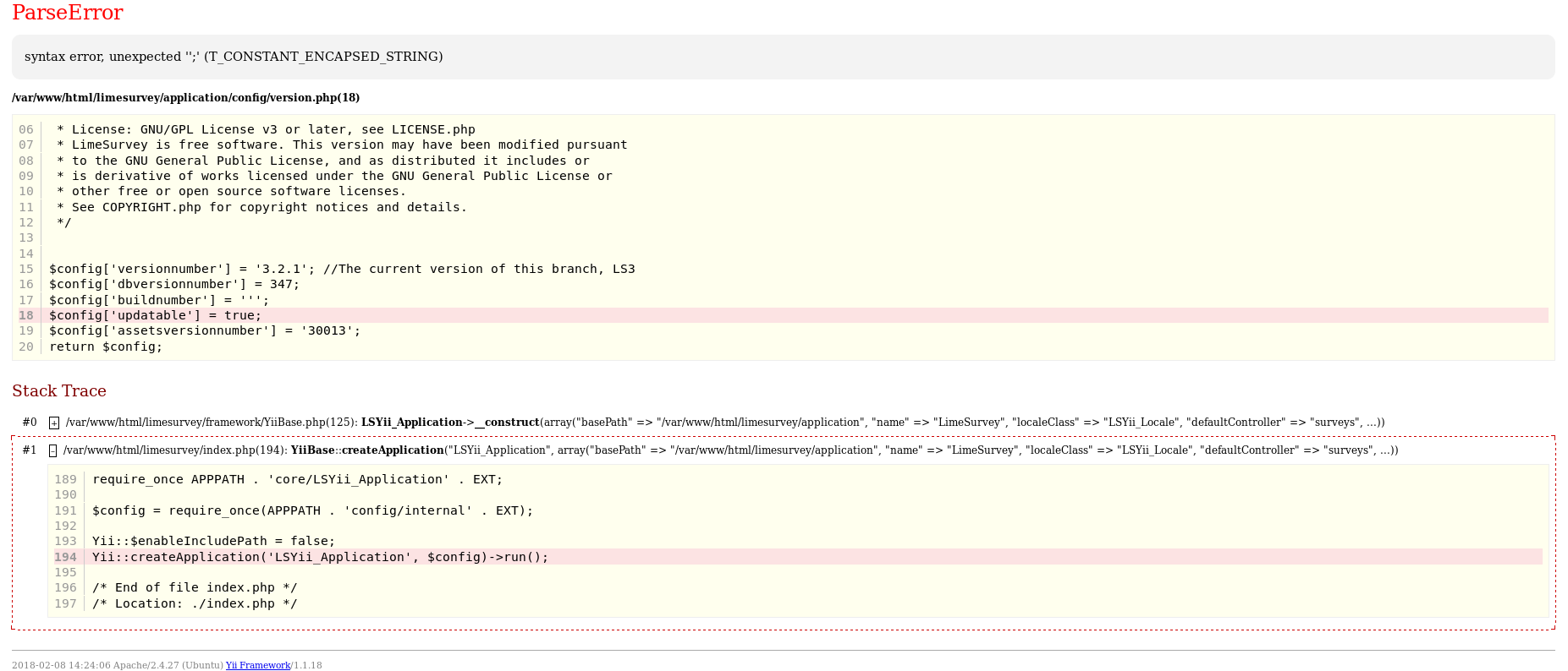 | Additional Information | File <limesurvey>/application/config/version.php contains the following line: $config['buildnumber'] = '''; This line contains 3 single quotes and should contain 2 single quotes with the build number. | ||||