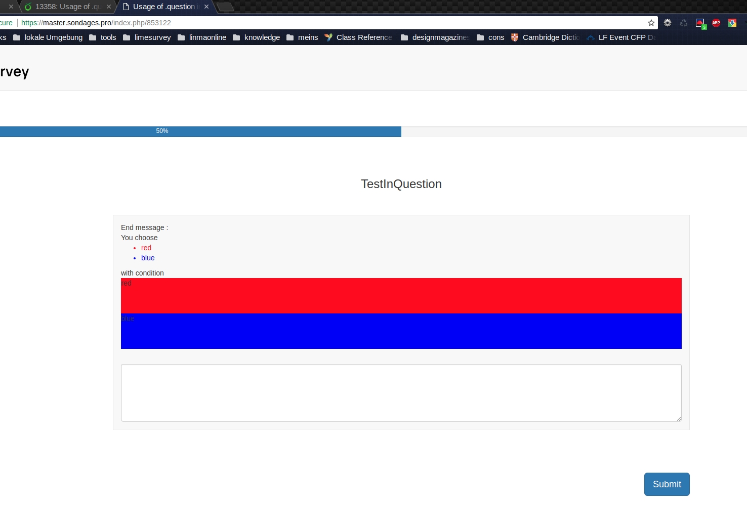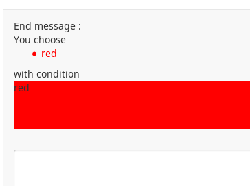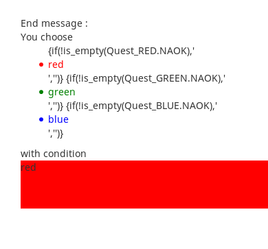 | Additional Information | It's OK in question text. OK show result in question, notOK in endmessage. Seems to be pseudo broken HTML {if(!is_empty(Quest_RED.NAOK),'<li style="color:red">red','')} {if(!is_empty(Quest_GREEN.NAOK),'<li style="color:green">green','')} {if(!is_empty(Quest_BLUE.NAOK),'<li style="color:blue">blue','')} | ||||