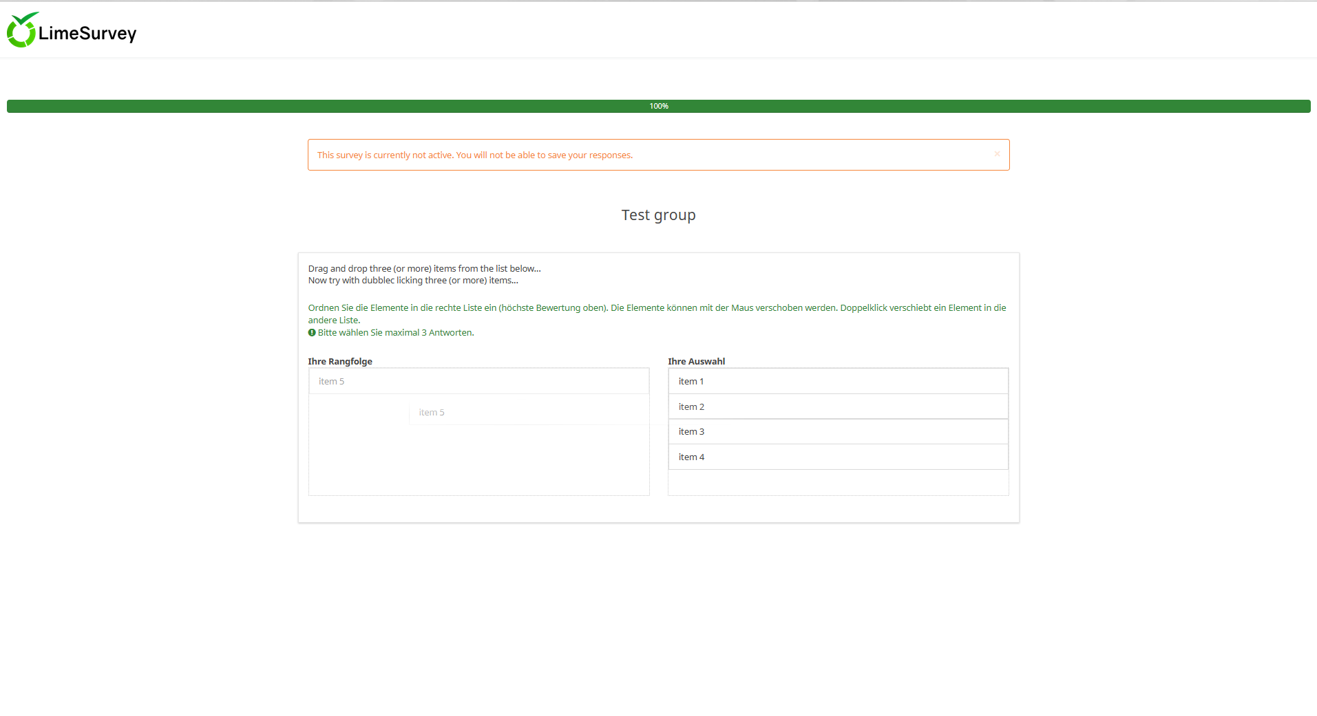 | Description | Limiting the answers of ranking questions does not work if user drags and drop the answers. | ||||